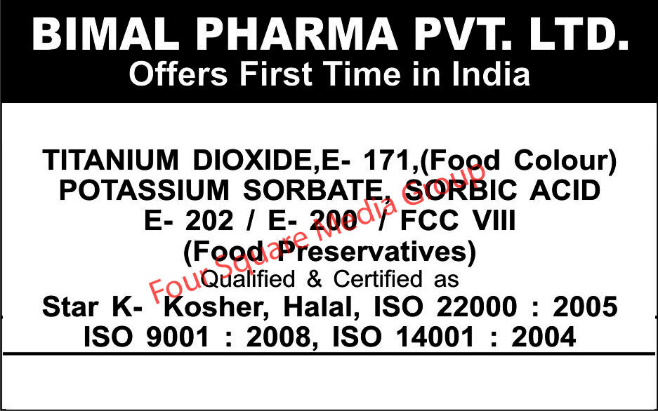 Food Colours, Titanium Dioxide, Food Preservatives, Potassium Sorbate, Sorbic Acid, FCC Vlll, Food Sweeteners, Aspartame, Acesulfame Potassium, Sucralose, Natural bio-Preservatives