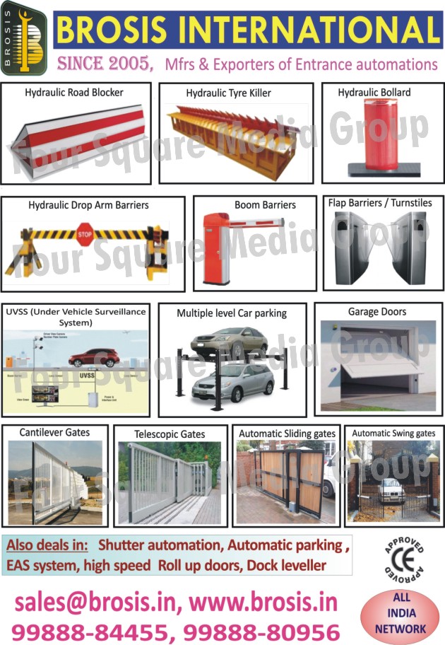Hydraulic Drop ARM Barriers, Sliding Gate Operators, Swing Gate Operators, Rising Bollards, Tripod Turnstile, Flap Barriers, Garage Door Automation, Hydraulic Road Blocker, Hydraulic Tyre Killer, Under Vehicle Surveillance Systems, Multi Level Car Parking, Cantilever Gates, Telescopic Gates, Entrance Automation, Shutter Automations, Automatic Parkings, EAS Systems, High speed Roll Up Doors, Dock Leveller, Road Safety Products, Multiple Level Car Parking, UVSS