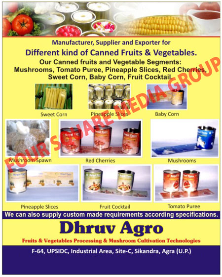 Canned Fruits, Canned Vegetables, Mushrooms, Tomato Purees, Pineapple Slices, Red Cherries, Sweet Corns, Baby Corns, Fruit Cocktails