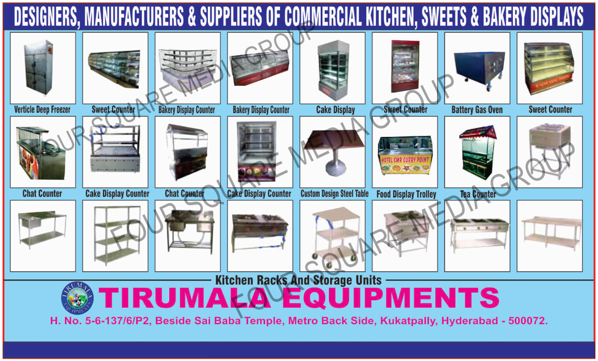 Commercial Kitchen Displays, Sweet Displays, Bakery Displays, Sweet Counters, Cake Displays, Deep Freezers, Bakery Display Counters, Battery Gas Ovens, Chat Counters, Cake Display Counters, Custom Design Steel Tables, Food Display Trolly, Tea Counters, Kitchen Racks, Kitchen Storage units,Kitchen Accessories, Kitchen Trolleys, Sweet Display Counters, Kitchen Freezers, Customized Steel Tables